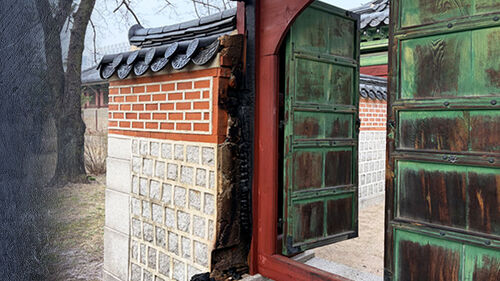 경복궁 내 삼비문 옆 쪽문 기둥과 기둥 밑 나무 일부가 까맣게 그을렸습니다.
