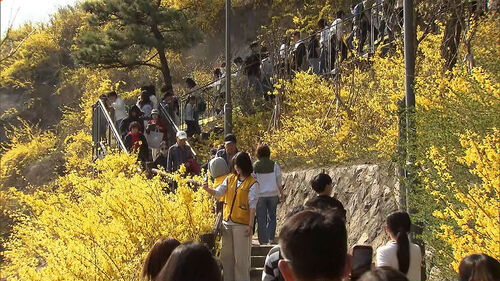 주말을 앞두고 개나리가 꽃망울을 터뜨리면서 봄을 즐기는 상춘객의 발길은 온종일 이어졌습니다.