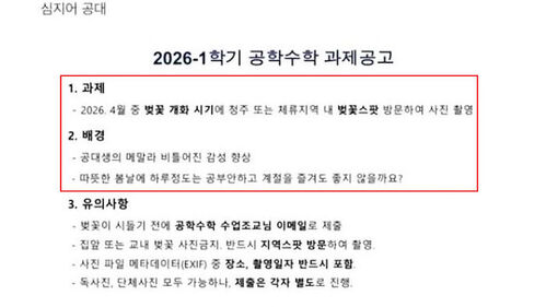 과제 안내에는 '공대생의 메마른 감성을 깨우고 봄을 즐겨보자'라는 취지의 문구도 담겨 있습니다.