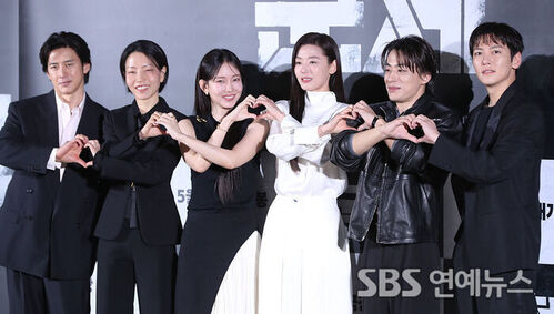 Actors Go Soo (from left), Kim Shin-rok, Shin Hyun-been, Gianna Jun, Koo Kyohwan, and Ji Changwook attend the production briefing for the film ‘Colony’ at CGV Yongsan I’Park Mall in Yongsan-gu, Seoul, on the morning of April 6 and pose for photos.