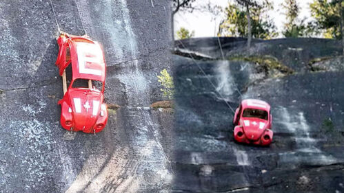 깎아지른 듯한 캐나다의 한 절벽에서 자동차 1대가 매달린 채 발견돼 눈길을 끌고 있습니다.