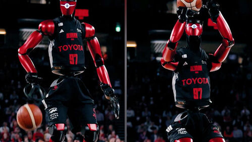 일본의 한 농구 경기장, 커다란 로봇이 코트 위에 등장합니다.