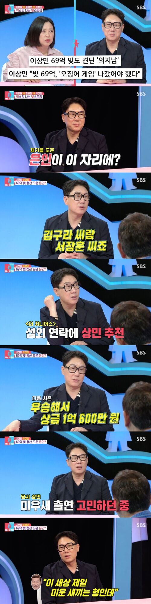 Kim Sook then brought up his debts, saying, “For Lee Sang-min, the amount disclosed alone was 6.9 billion won.” Lee replied, “Honestly, that was the starting amount. After that, some creditors wanted more, so it kept increasing.”