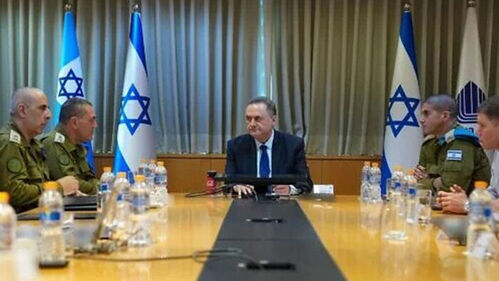 ▲ 이스라엘군 수뇌부와 전황 평가 회의하는 이스라엘 카츠 국방부 장관(가운데)