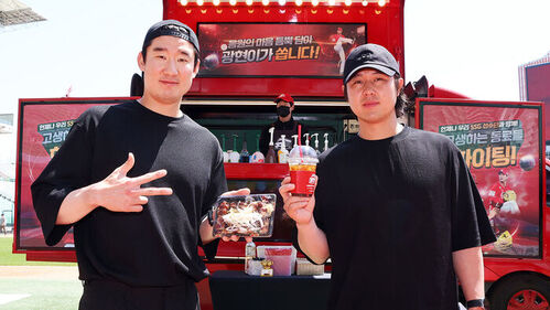 ▲ 김광현이 보낸 푸드트럭 앞에서 포즈 취한 오태곤(왼쪽)과 최정