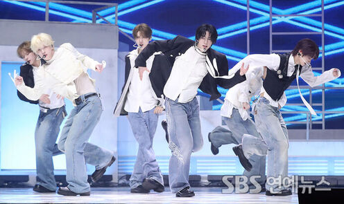 The group TWS is performing their title track "You, You" at the media showcase held to commemorate the release of their 5th mini album, "NO TRAGEDY," at Yes24 Live Hall in Gwangjin-gu, Seoul, on the afternoon of April 27.