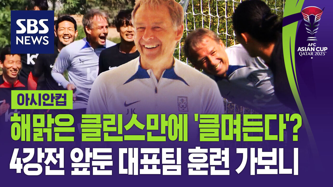 클린스만호가 2023 아시아축구연맹(AFC) 카타르아시안컵 결승행 길목에서 요르단과 다시 맞붙습니다. 우리 대표팀 선수들은 준결승전을 앞두고 밝은 분위기 속에 컨디션을 끌어올렸습니다. 위르겐 클린스만 감독은 선수들 사이에서 환한 미소로 함께 훈련하는 모습으로 포착됐습니다. 클린스만 감독은 훈련장뿐 아니라 경기장, 기자회견장에서도 늘 밝은 표정을 보였는데, 지난 조별리그 3차전 말레이시아전과 비긴 뒤에도 미소 띤 모습이 포착돼 기자회견에서 "왜 웃었냐"는 질문을 받기도 했습니다. 16강 사우디전과 8강 호주전에서 극적인 승리로 4강 진출에 성공하자 일부 축구 팬들은 "클며들었다"며 클린스만 감독에 대한 애정을 드러내기도 했습니다. 클린스만 소통법을 엿볼 수 있는 대한민국 선수들의 4강전 대비 훈련장 모습을 담았습니다.