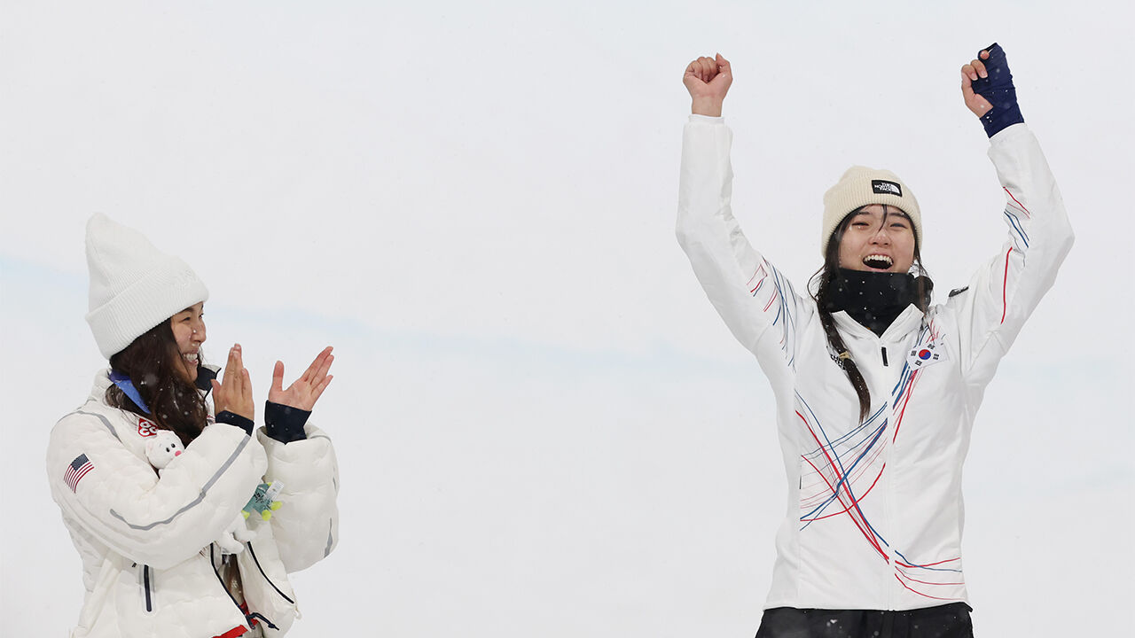 ▲ 현지시간 12일 동계올림픽 스노보드 여자 하프파이프 결승에서 은메달을 딴 미국의 클로이 김이 최가온을 축하하고 있다.
