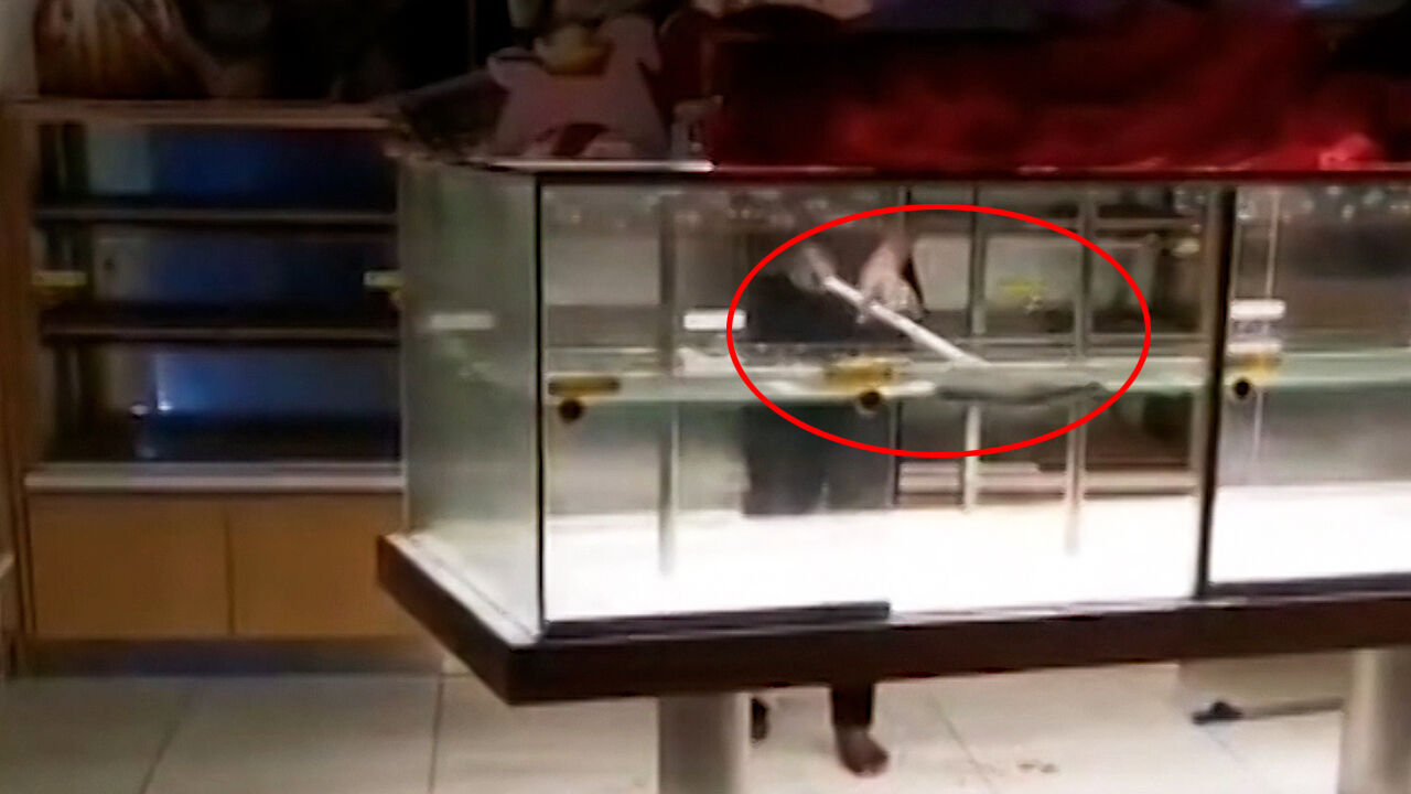 한 직원이 유리로 된 진열장 안을 열심히 빗자루로 쓸고 있는데요.