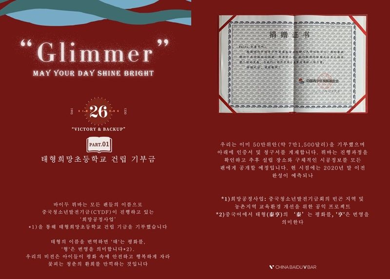 지난 11일 방탄소년단 뷔의 중국 최대 팬클럽 '바이두뷔바'가 '태형희망초등학교'의 건립을 공식 발표했습니다. 바이두뷔바는 중국청소년발전기금(CYDF)이 진행하고 있는 '희망공정사업'을 통해 태형희망초등학교 건립 기금 50만 위안(약 8천500만 원)을 기부했다고 밝혔습니다.