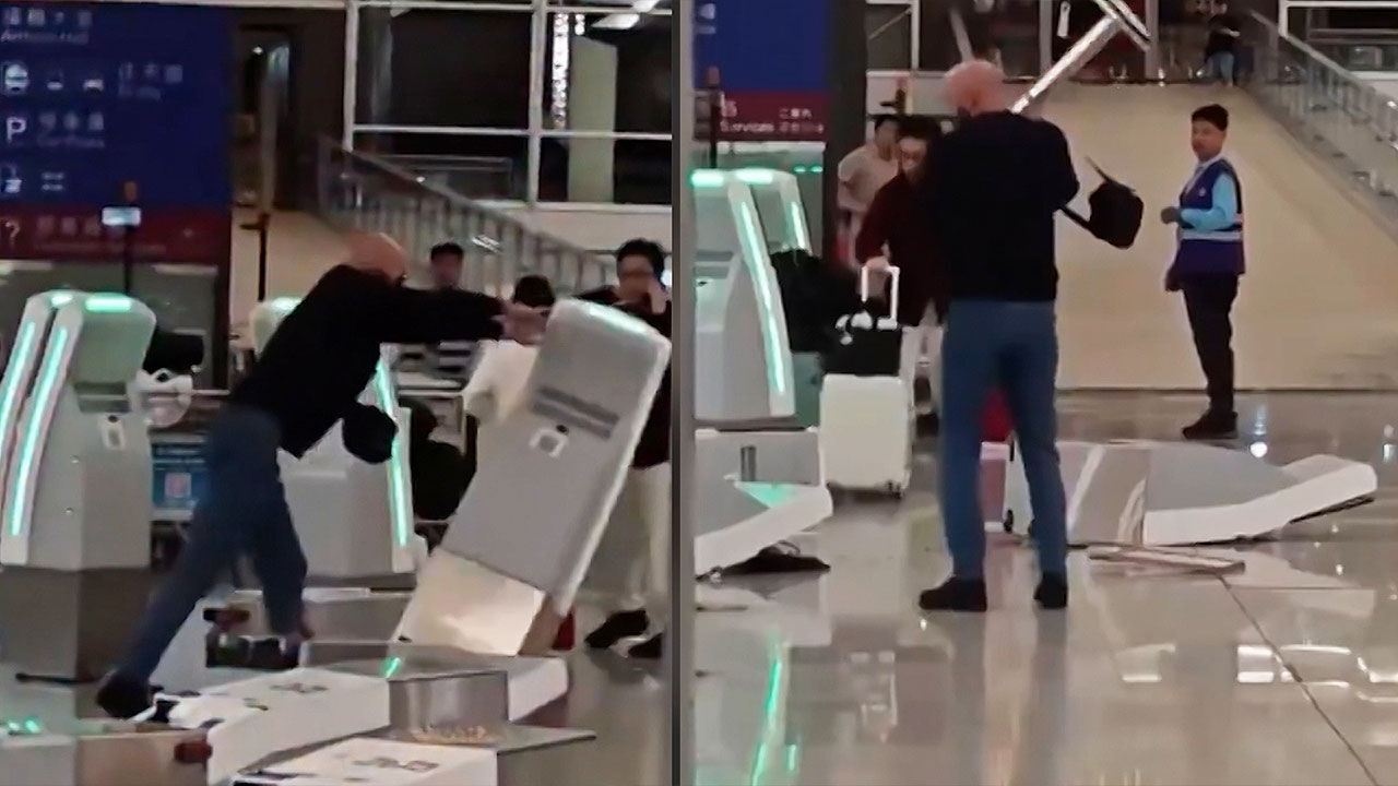 자동 체크인 키오스크를 연달아 밀어 넘어뜨린 남성은 이어 금속 봉을 들어 키오스크를 부쉈고, 놀란 승객들과 공항 직원들은 황급히 몸을 피했습니다.