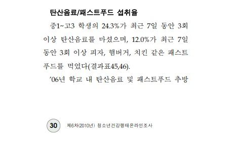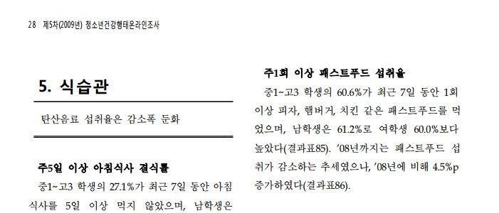 -비슷한 조사 중에 교육부에서 실시하는 '학교건강검사 표본조사'가 있다. 신체 발달사항, 비만도 등이 주된 내용인데 여기에도 패스트푸드 섭취율 조사가 있다. 2009년부터만 봐도 2014년까지 섭취율이 꾸준히 증가하고 있다.