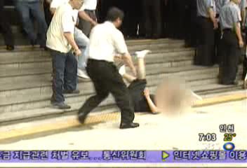 26일 아침 서울 영등포경찰서에서 지난 2월 피살된 피해자의 어머니 51살 정 모씨가 갑자기 달려들자 유영철을 호송하던 서울경찰청 기동수사대 소속 이 모 경사가 발길로 심하게 걷어차 비난 여론이 확산돼 왔습니다.