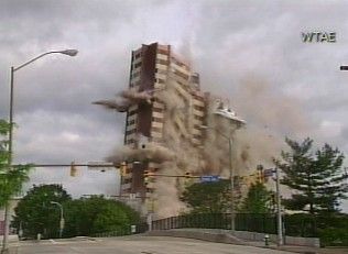 오른쪽 부분부터 폭파가 시작되더니, 순식간에 건물 전체가 오른쪽으로 기울면서 무너졌습니다.