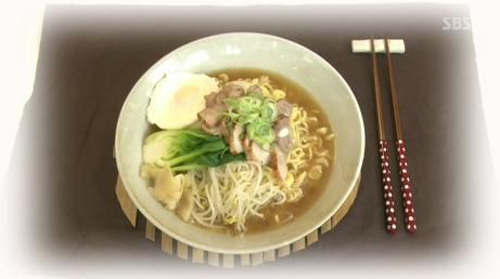 7. 삶아 놓은 면 위에 양파, 데친 숙주, 청경채, 생강, 초절임, 삶은 계란, 돼지고기 조림, 파를 올린다.