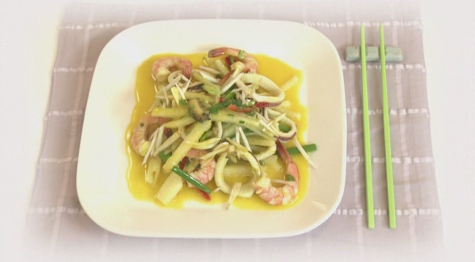 4. 데친 해산물을 식기 전에 소스를 넣고 버무리다가 채 썬 무, 파프리카, 쪽파, 배를 넣고 한 번 더 버무린다.
