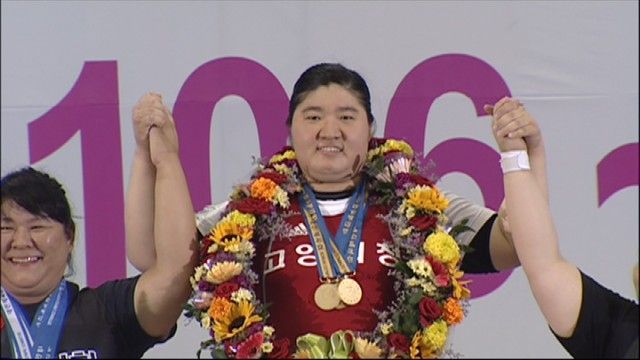 한국 여자 역도의 간판 장미란 선수가 전국체전에서 9년 연속 3관왕에 올랐습니다. 국내에는 역시 경쟁자가 없습니다.