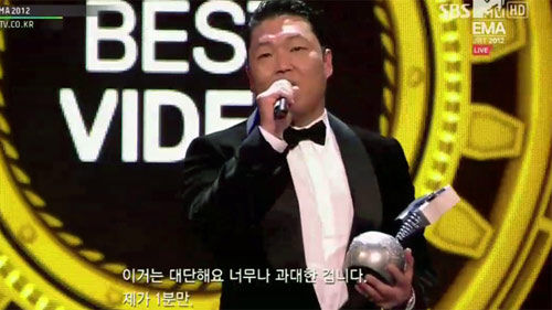 싸이는 12일 독일 프랑크푸르트 페스트할레에서 열리고 있는 EMA 2012에서 베스트 비디오(BEST VIDEO) 트로피를 거머쥐었다. 한국 최초다.