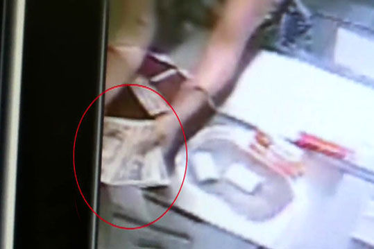 직원이 쉽게 찾지 못하자 직접 넘겨받아 뒤적이더니, 돌려주는 척 하다 재빨리 지폐 한 뭉치를 가방으로 빼돌립니다.