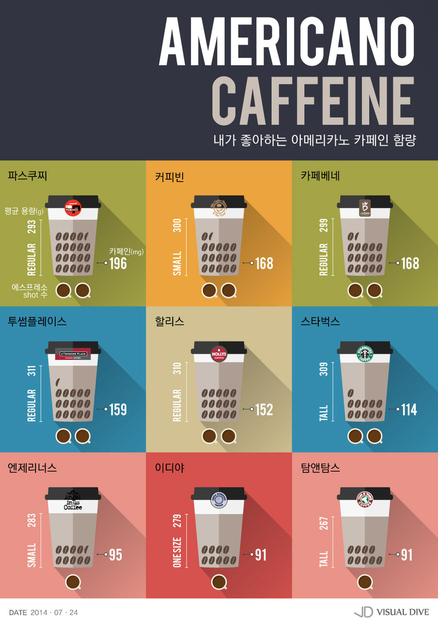 한국소비자원이 스타벅스, 커피빈, 파스쿠찌 등 시중 9개 브랜드의 아메리카노 제품 카페인 함량을 측정한 결과 브랜드 별로 카페인 함량이 많기는 2배 정도 차이가 있었다고 밝혔다. 측정 결과 아메리카노 1잔의 카페인 함량이 가장 낮은 곳은 이디야 커피(91mg)와 탐앤탐스(91mg)로 조사됐고 가장 높은 곳은 파스쿠찌(195mg)로 카페인 함량이 낮은 곳에 비해 2배 이상 높았다.