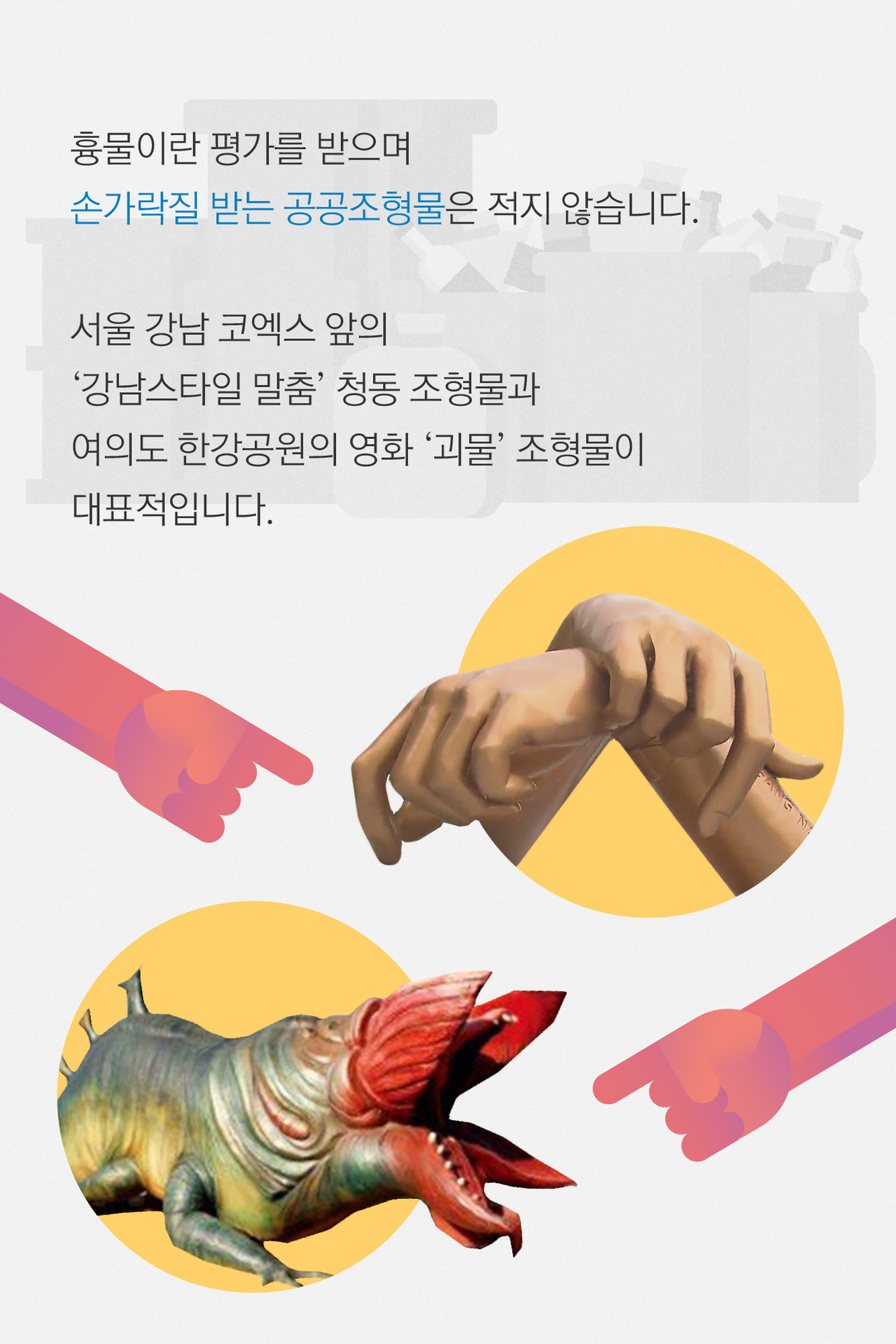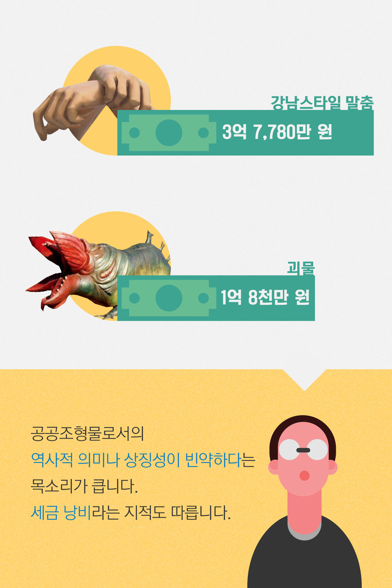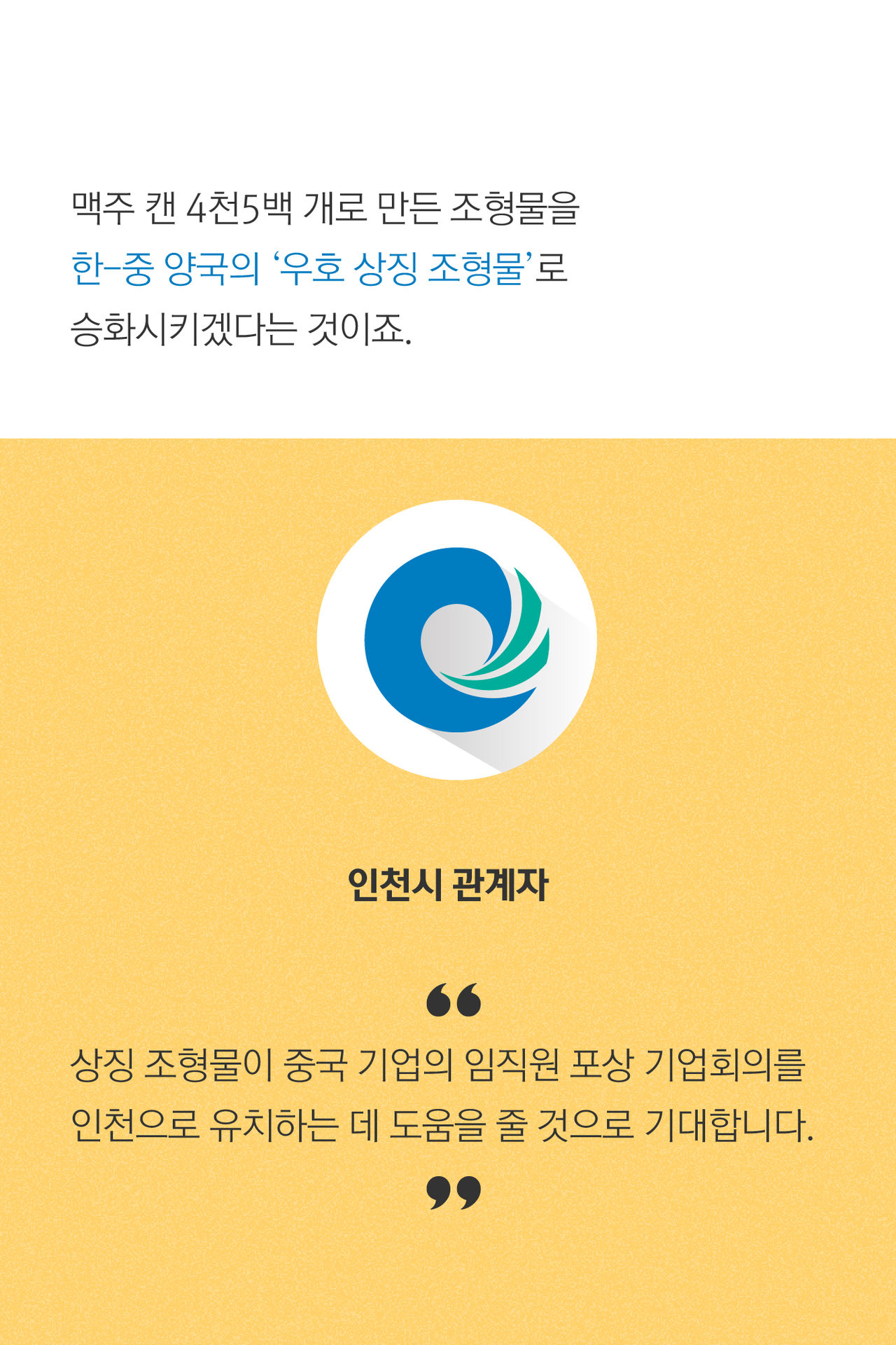 인천시가 맥주 캔으로 만든 조형물을 설치할 계획입니다. 지난 3월 월미도에서 중국인 4천5백 명이 즐긴 '치맥 파티'를 기념하기 위해서죠. 한-중 양국의 '우호 상징 조형물'로 만들겠다는 것입니다. 하지만 흉물로 전락할 것 같다는 우려가 제기됐습니다. 강남 코엑스에 설치된 '강남스타일 말춤' 청동 조형물과 영의도 한강공원의 영화 '괴물' 조형물처럼 말입니다. 더 이상 소중한 세금으로 만든 것이 의미를 알 수 없는 '애물단지'가 되지 않도록 해야 하지 않을까요?