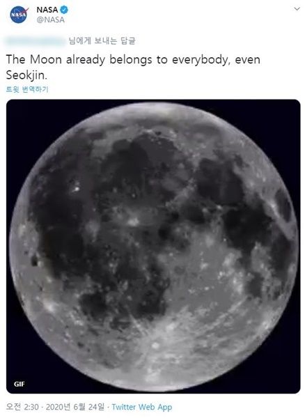 현지 시간으로 23일 나사는 공식 트위터 계정에 "달은 이미 모두의 것입니다. 석진에게도 말이죠"라는 글과 함께 달이 자전하는 짧은 영상을 올렸습니다.