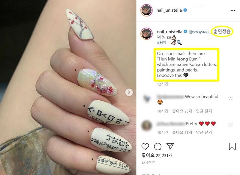 이후 지수의 네일아트를 맡고 있는 네일리스트 박은경 씨가 인스타그램을 통해 "훈민정음 네일. 한국 고유의 글자와 그림을 담았다"라며 지수의 네일아트를 소개했습니다.