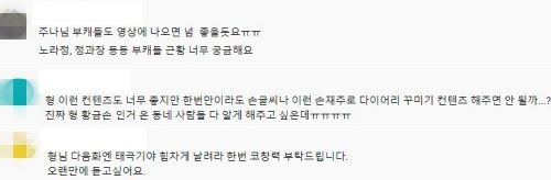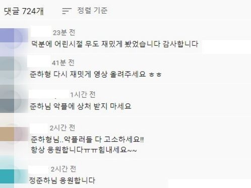 채널에 올라온 영상들의 댓글 창에는 "영상 조회 수가 1만을 못 넘기네", "유튜브 안 하셨으면 좋겠어요" 등 콘텐츠 내용과는 무관한 악플이 가득했는데요, 이 사실이 각종 온라인 커뮤니티를 통해 전해지자 많은 누리꾼이 힘을 합쳐 '선플'을 달기 시작했습니다. 누리꾼들은 "어린 시절 '무한도전' 재밌게 봤습니다"라며 감사 인사를 전하고, "악플에 상처받지 말고 다시 영상 올려주세요"라며 정준하를 응원했습니다.