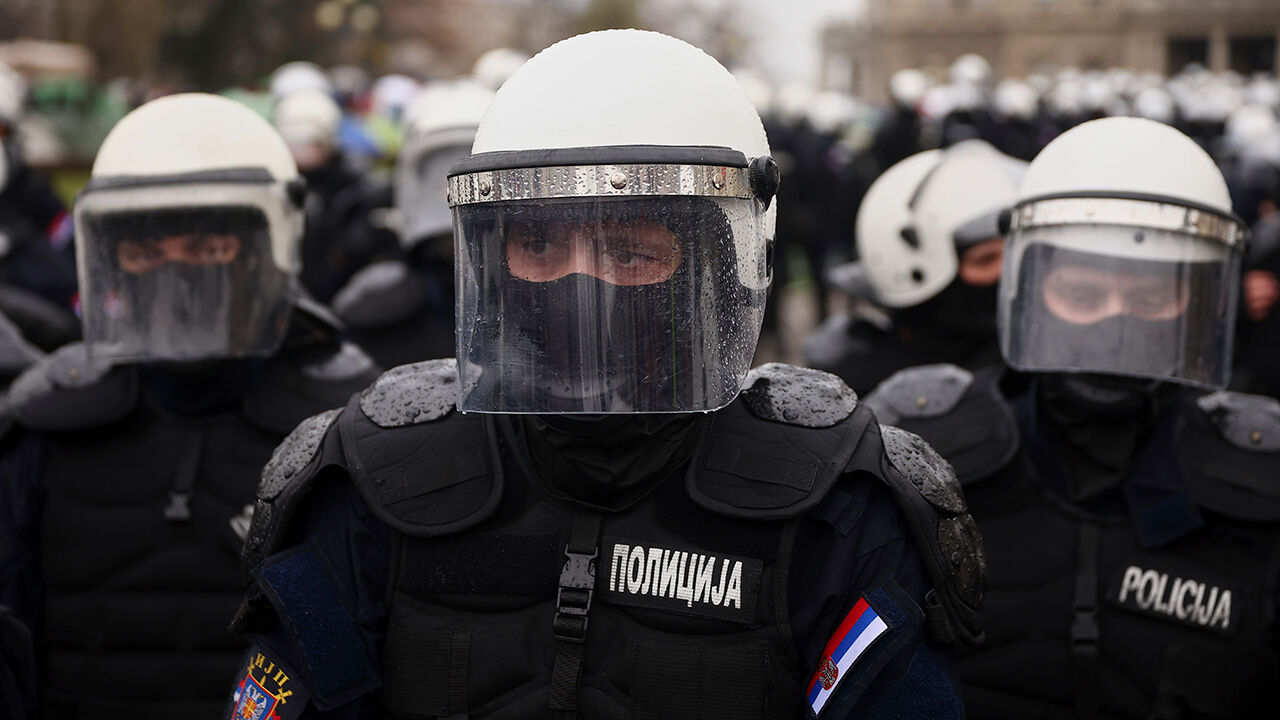 ▲ 15일(현지시간) 세르비아 수도 베오그라드에서 대규모 반정부 시위가 열린 가운데 시위 진압 경찰이 의회의사당 주변 지역을 봉쇄하고 있다.