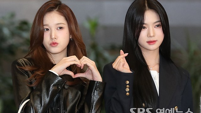 STAYC’s J (left) and ISA turned Gimpo International Airport into a mini red carpet on the morning of April 9, striking poses before jetting to Yokohama, Japan, for the 2024 Asia Star Entertainer Awards.