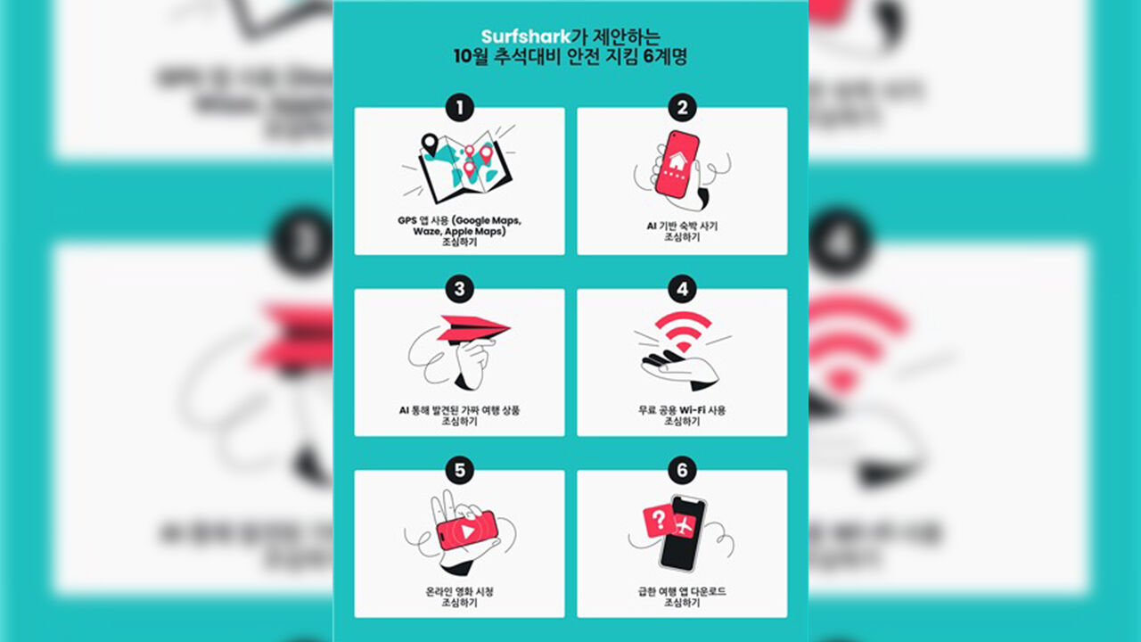 서프샤크는 추석 연휴를 맞아 여행을 떠나며 자신도 모르게 개인정보를 위험에 노출하는 경우가 많다며 이용자들이 경계를 늦추고 활발히 온라인 활동을 하는 10월이 사이버 범죄자들에게 최적의 시기가 될 수 있다고 경고했습니다.