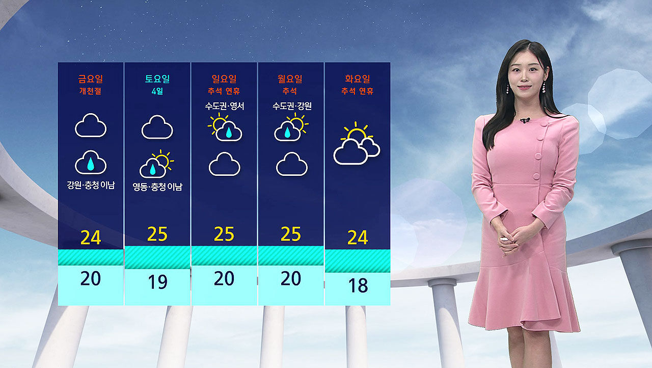 남부지방은 흐린 가운데 밤이 되면 충남과 호남, 제주 지역에 비가 내리겠고 개천절인 내일은 충북과 경남 지역에, 오후가 되면 영동과 경북 지역까지 비구름이 확대되겠습니다.