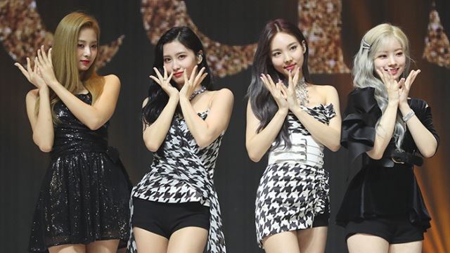 From left, Tzuyu, Momo, Nayeon and Dahyun of TWICE pose for photos at a media showcase celebrating the group’s eighth mini-album, “Feel Special,” at YES24 Live Hall in Seoul on Sept. 23.