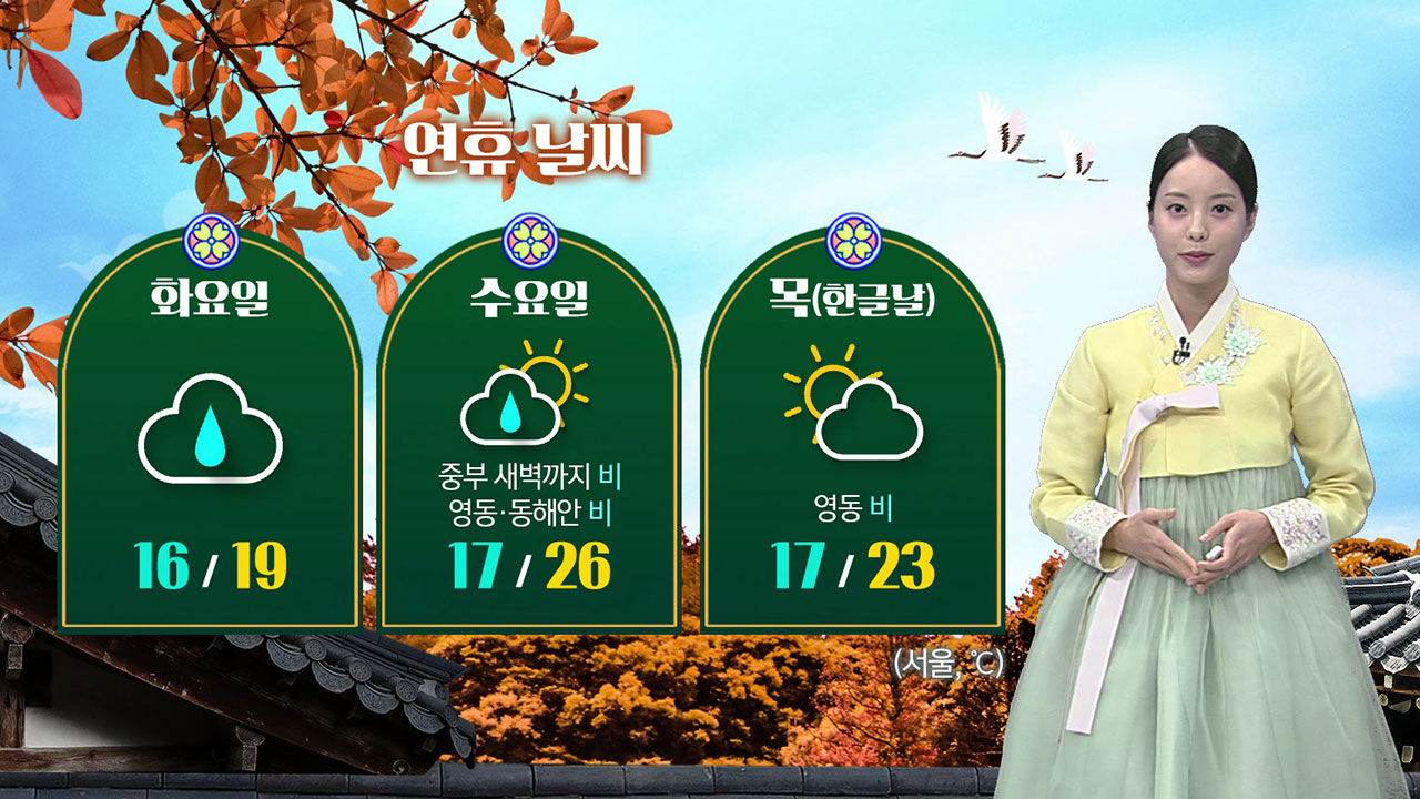 중부 지방의 비는 모레 새벽까지 이어지다 그치겠고 연휴 후반에는 동해안을 중심으로 비가 내릴 전망입니다.