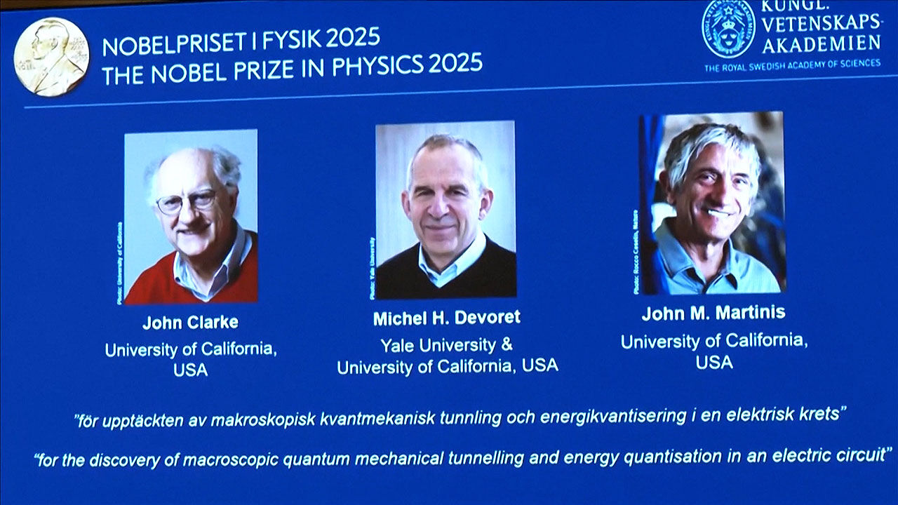 올해 노벨 물리학상은 영국의 존 클라크, 프랑스의 미셸 드보레, 미국의 존 마티니스 등 3명의 과학자에게 돌아갔습니다. 스웨덴 왕립과학원 노벨위원회는 거시 규모에서 나타나는 양자역학적 효과에 대한 연구 공로로 노벨 물리학상을 수여한다고 밝혔습니다. 오늘(8일) 화학상과 내일 문학상에 이어 모레엔 평화상, 13일엔 경제학상 수상자 발표가 남아 있습니다.
