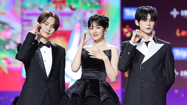 SHINee’s KEY, IVE’s AN YUJIN and TOMORROW X TOGETHER’s YEONJUN lit up the red carpet at the 2023 SBS Music Awards on Dec. 25 at Inspire Arena in Incheon, striking poses for the cameras as the night’s MC trio.