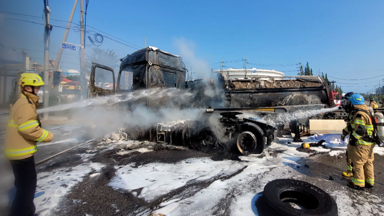 [소방 관계자 : 도로 한가운데라서 다른 쪽으로 더 불이 옮겨붙거나 그런 상황은 아니었습니다. 기름이 흘러나와서 (방제) 작업을 좀 하긴 했고요.]