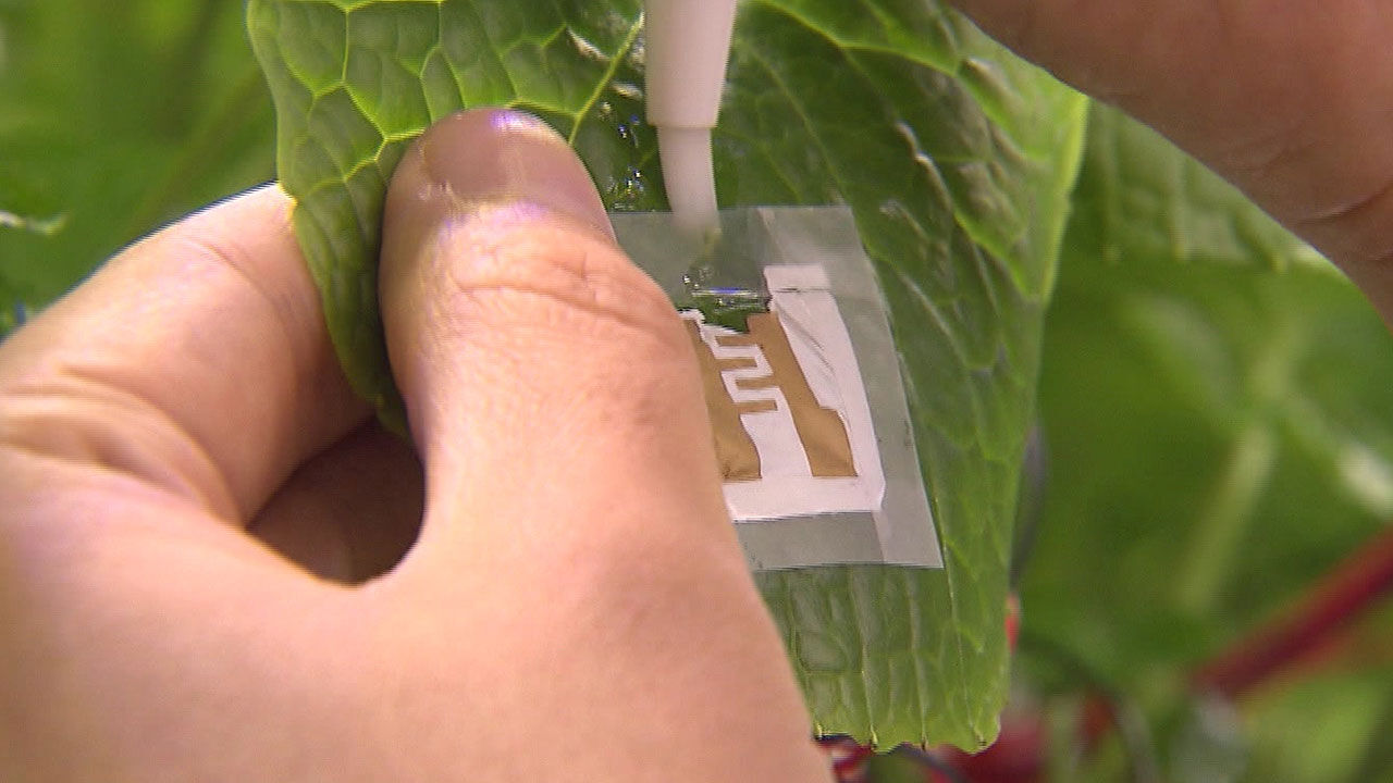 이파리에 머리카락 1천분의 1 수준의 얇은 전극 센서를 도포하고, 식물이 스트레스를 받으면 나오는 전기 신호를 포착합니다.