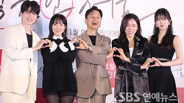 The cast of 'Single in Seoul' ― Lee Dongwook (far left), Lim Soo-jung, Jang Hyun-sung, Lee Mi-do and Ji Yi-soo ― pose for photos during the film’s production briefing at Lotte Cinema Konkuk University in Seoul on Nov. 3.