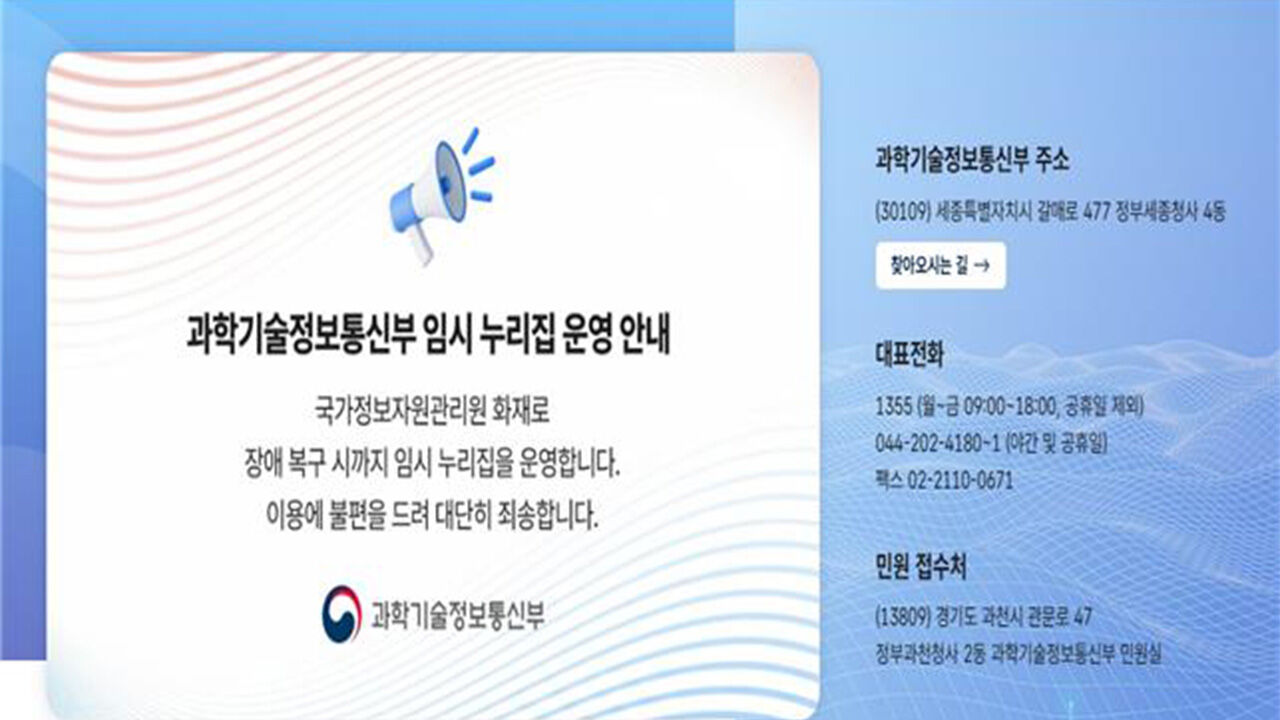 국가정보자원관리원 화재로 과기정통부 대표 홈페이지 서비스가 일시 중단된 가운데 과학기술정보통신부는 오늘(15일) 임시 홈페이지, www.msit.go.kr를 개통했다고 밝혔습니다.