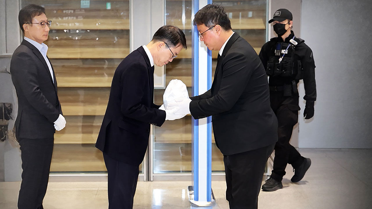 검은 정장을 입은 경찰이 조심스레 흰 천으로 쌓인 단지를 전달합니다.