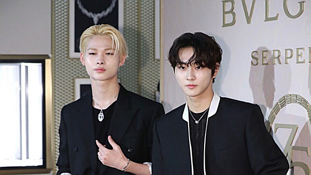ENHYPEN's NI-KI (left) and JUNGWON stepped out on June 28 at Seoul's Kukje Gallery for an Italian jewelry brand exhibition, posing for photographers on the event's photo wall.