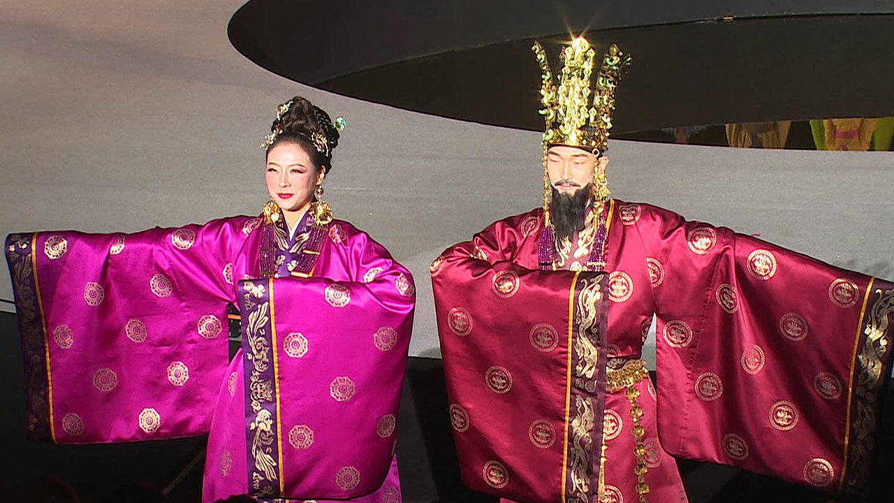 음악에 맞춰 신라 왕이 입었던 정복, 신라 왕복을 입은 모델이 입장하자 객석에서 박수가 터져 나옵니다.