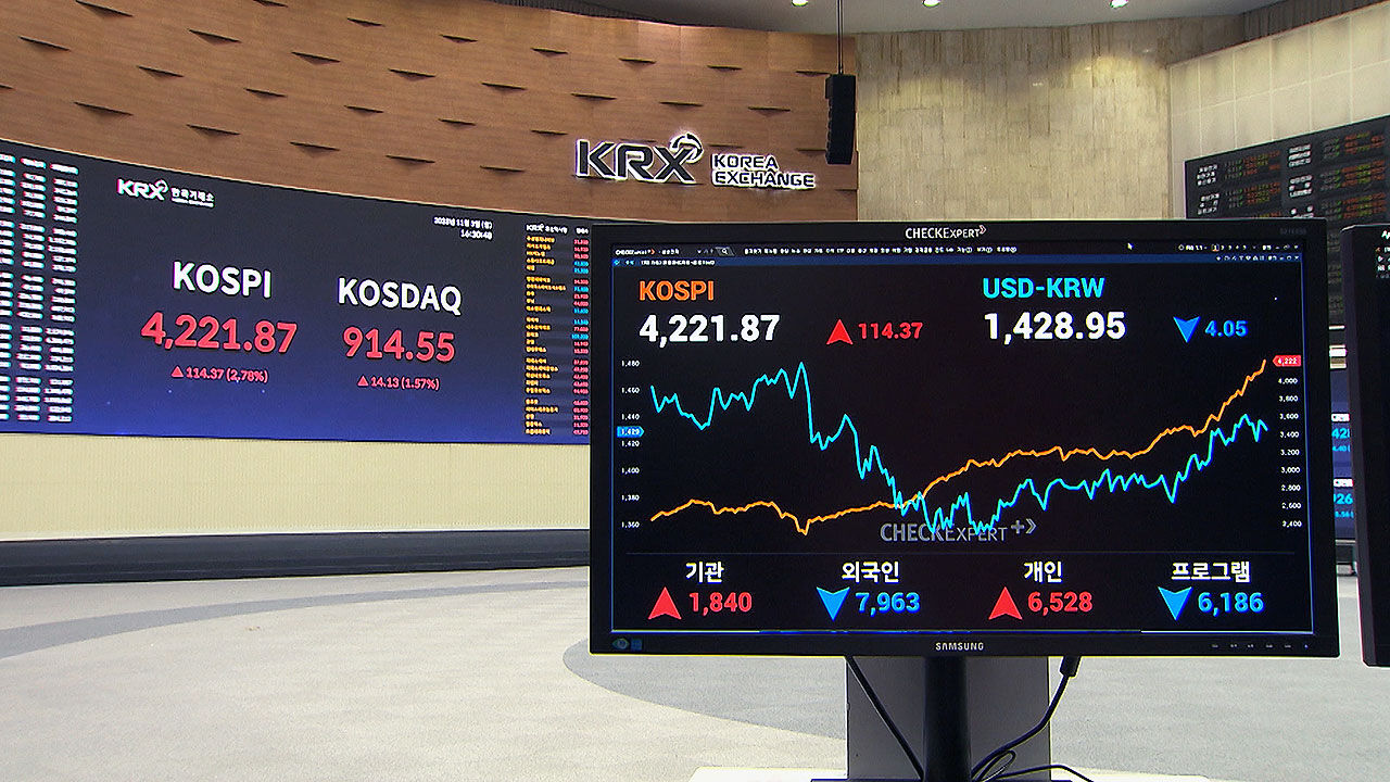 코스피는 2.78%, 114.37포인트 오른 4221.87로 주간 거래를 마감했습니다.