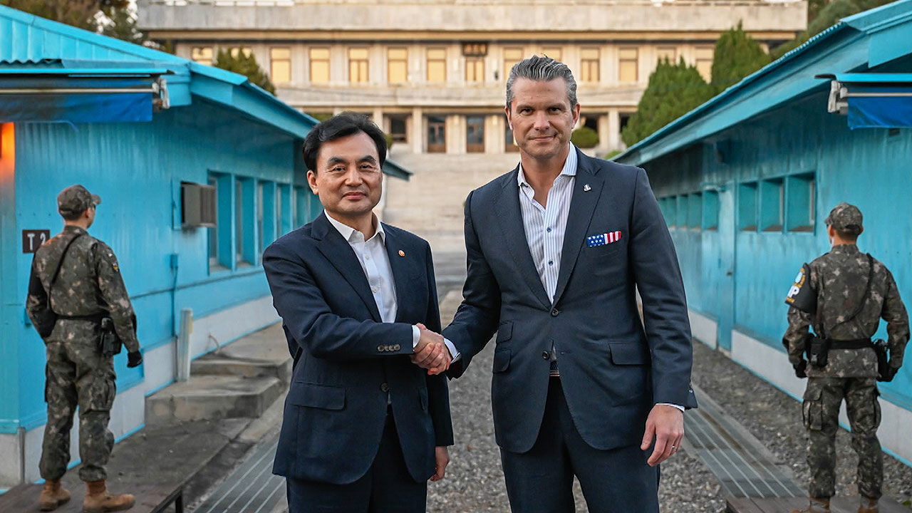 안규백 국방장관과 방한한 피트 헤그세스 미 국방장관이 판문점 공동경비구역 JSA를 배경으로 악수합니다.