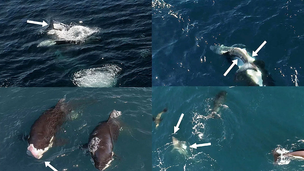 범고래 무리가 표적으로 삼은 백상아리 주변을 에워싼 후 주둥이로 백상아리를 건드리는 모습이 담겼습니다.