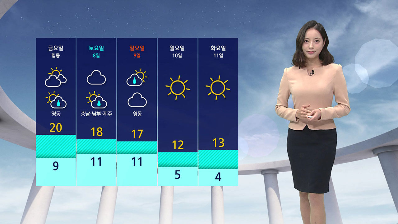 서울이 7.8도, 춘천 3.1도, 광주 8도로 시작해 낮 기온 서울, 춘천 19도, 광주 21도로 대체로 선선하겠습니다.