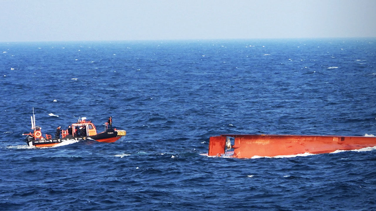 어선 한 척이 바다 위에 뒤집혀 있고, 해양경찰관이 그 위에 올라가 선체를 두드립니다.