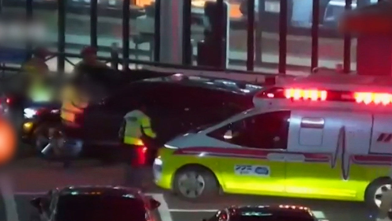 119 구조대원들이 검은색 승용차 주변을 둘러싸고, 잠시 뒤에는 차량 주변에 차단선이 설치됩니다.