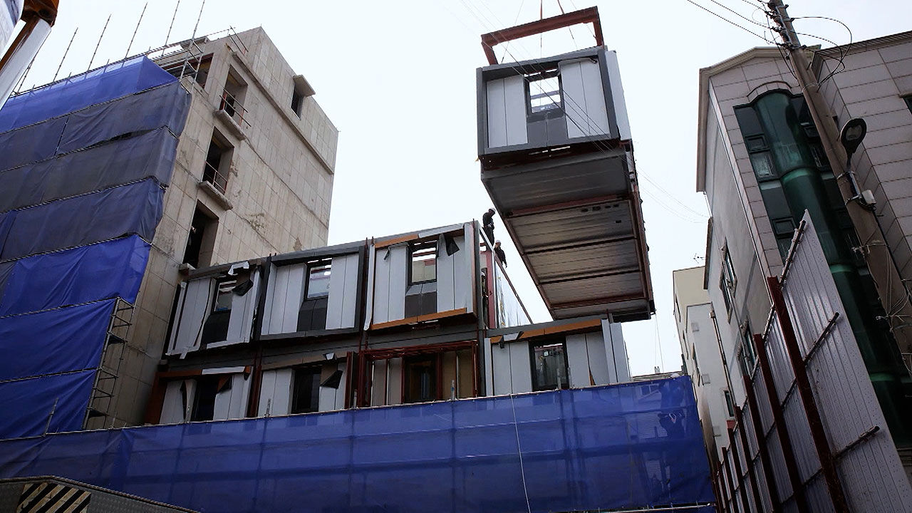 사실은 공장에서 제작한 모듈 형태의 집을 이곳으로 운반한 뒤 쌓아 올려 조립한 '모듈러 주택'입니다.